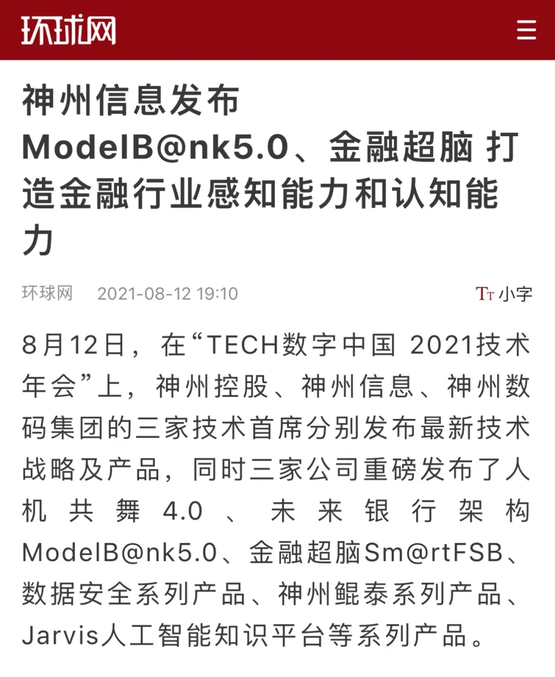 神州信息发布银行架构ModelB@nk5.0、金融超脑Sm@rtFSB
